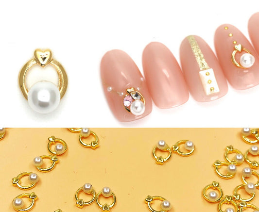 10 pcs 3D pearl round ring Metallic nail studs / heart shape golden ring circle pearl charm nail art