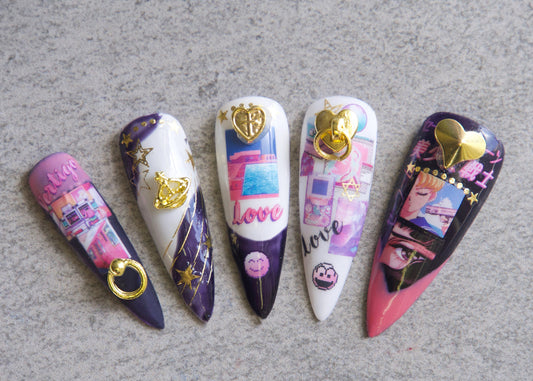 5pcs 3D Punk Gold nail studs / Planet Silver hearts shape golden Ring Circle charm nail art