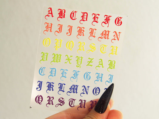 Gothic Script Colorful Nail Art Stickers Decals/ 3D Embossed Gothic minuscule Hand Writing holographic Retro Letters Alphabet Letters