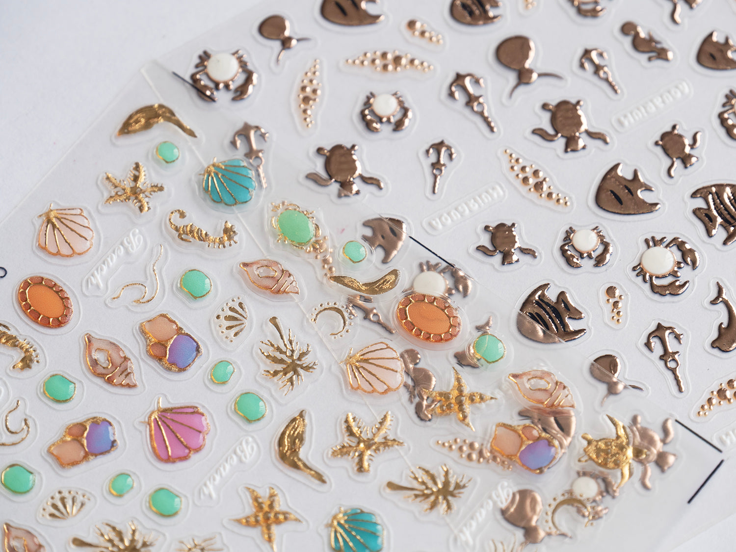 Create beautiful ocean-inspired nails with these gold foil ocean nail stickers. Featuring sea turtles, seashells, and marine elements, these decals use hot-stamped foil for a shiny, elegant finish. With built-in self-adhesive backing, they’re easy to apply and perfect for DIY nail art, press-on nails, or summer designs.