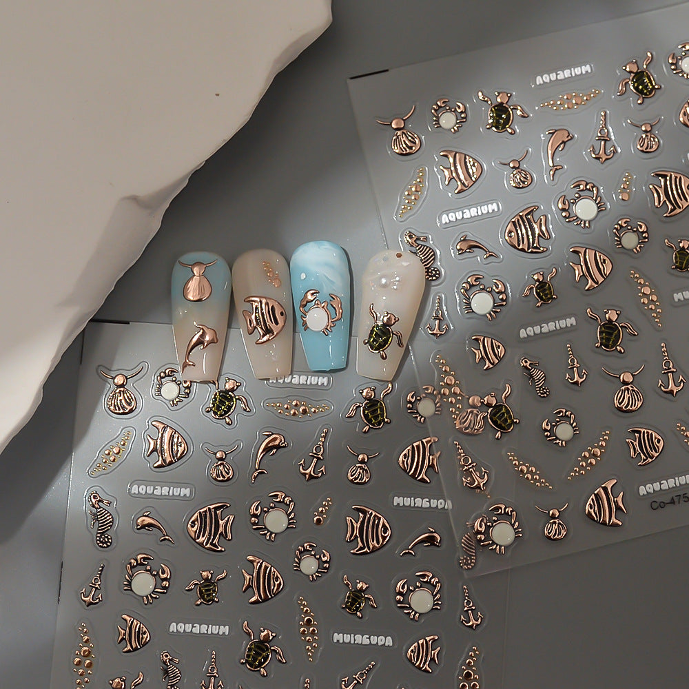Gold Foil Ocean Nail Stickers – Sea Turtle Fish Sea Star Seashell Nails Decals
