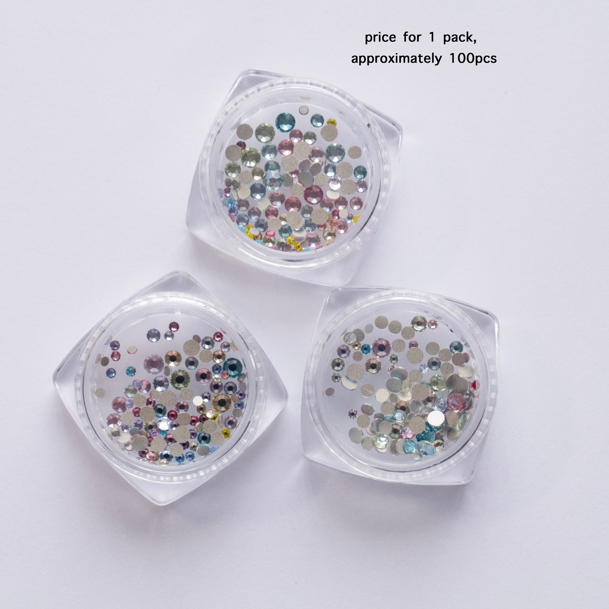 Make your nails shine with these 33-cut colorful nail rhinestones. Featuring a high-sparkle multi-facet cut, these mini round flat-back crystals come in mixed sizes with a translucent white finish that reflects vibrant colors under light. Perfect for DIY manicures, press-on nails, and professional nail art.