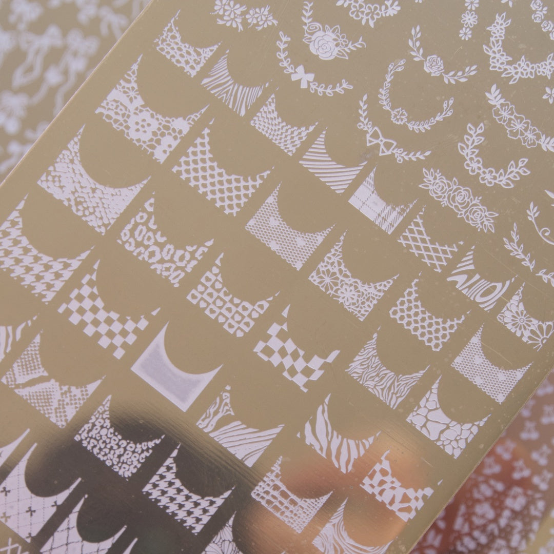 Create elegant and precise nail designs with this nail stamping plate. Featuring French tip lines, diamond grid patterns, and bow prints, it’s perfect for classic French manicures, geometric styles, and cute decorative nail art. A must-have nail transfer tool for both beginners and professionals.