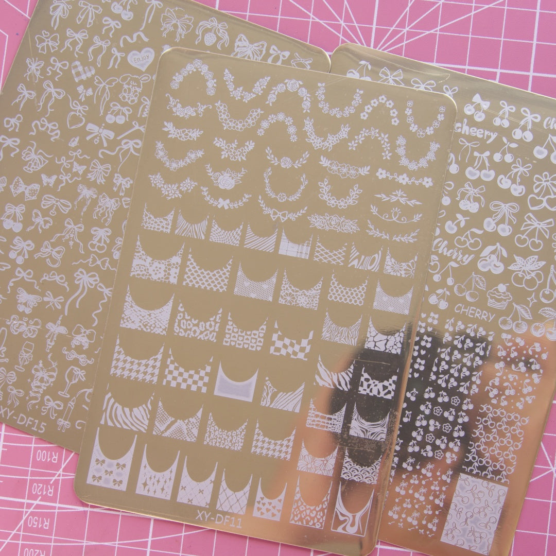 Nail Stamping Plate – French Line with patterns, Cherry & Bow Designs | Nail Transfer Printing Tool for DIY Manicure